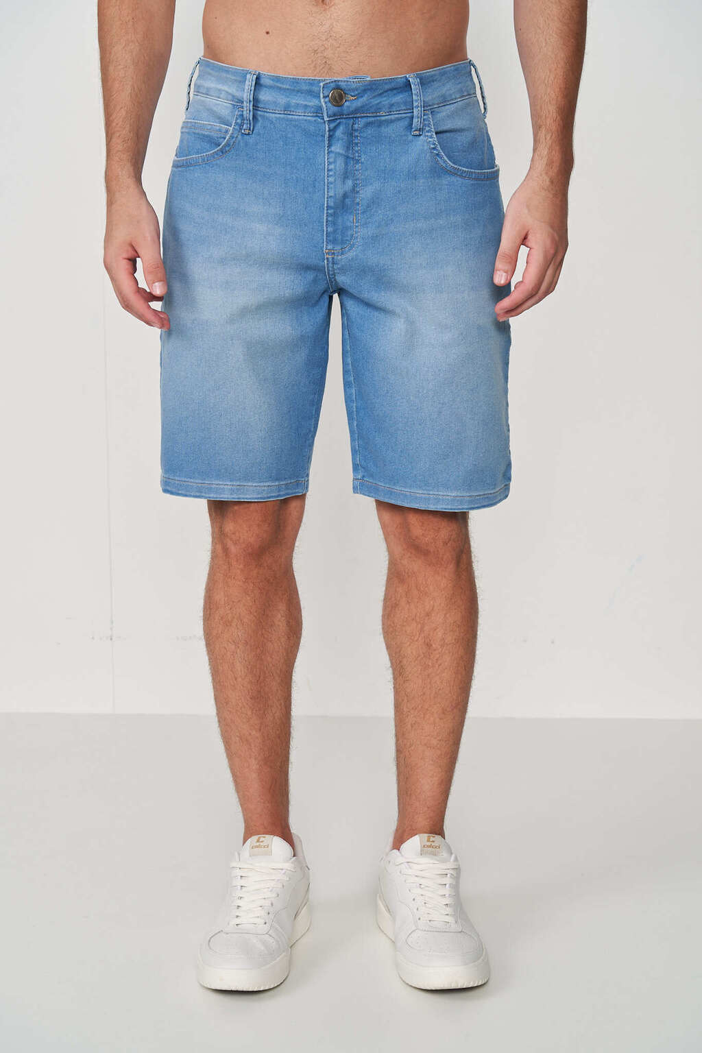 O tom de azul claro e a lavagem estonada trazem um ar despojado e moderno para o visual, e o caimento impecável da bermuda realça a silhueta masculina.