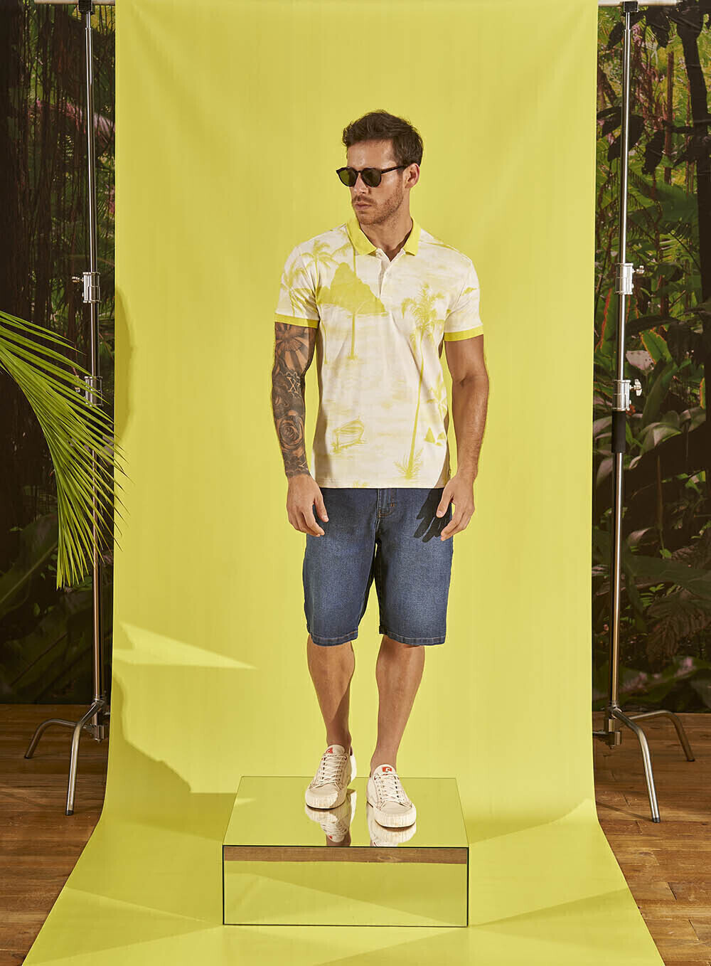 Bermuda jeans apresenta base Noah com comprimento pouco abaixo do joelho. A peça possui cós com passantes, abertura frontal com fecho de zíper e botão, bolsos dianteiros, traseiros e bolso relógio.