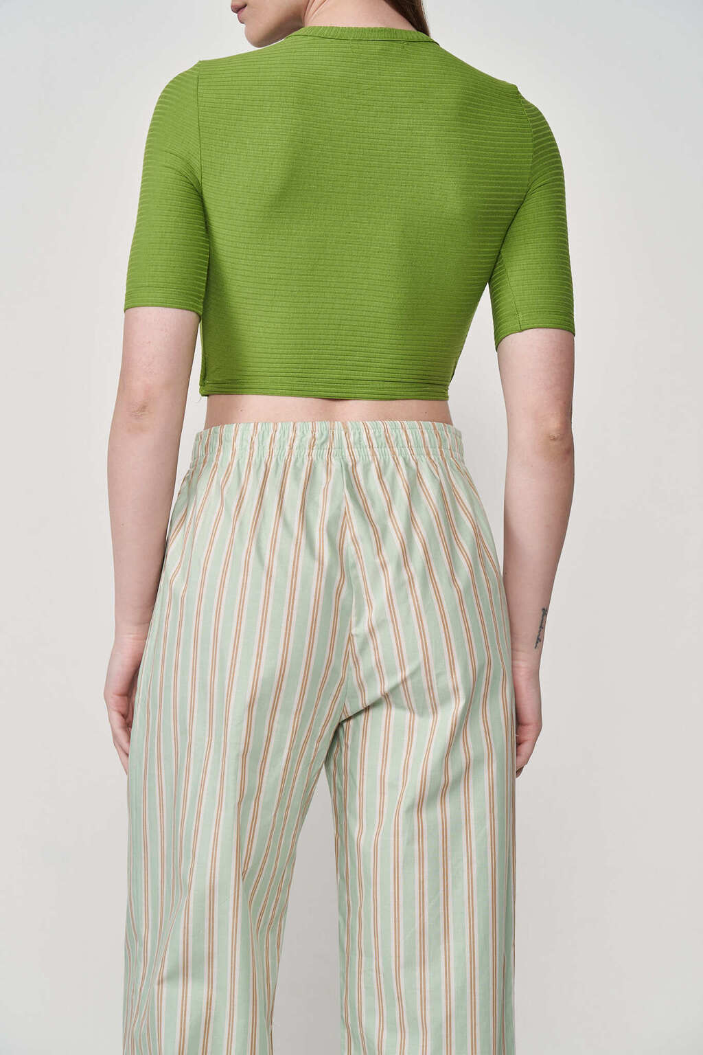 O tecido canelado proporciona um caimento impecável, enquanto o corte cropped destaca a silhueta feminina.