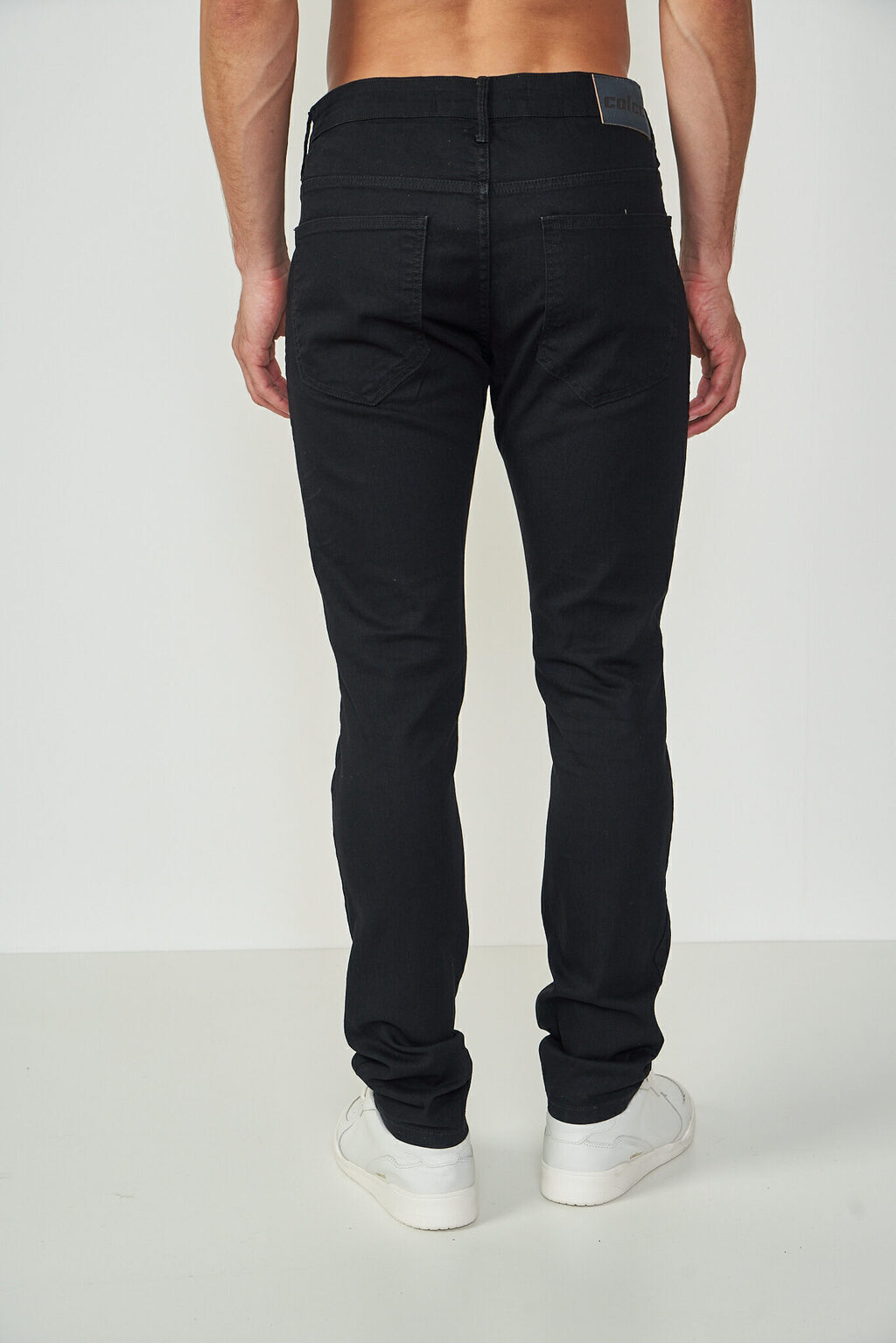 Calça Jeans: Modelagem slim, cós tradicional, cor preta.