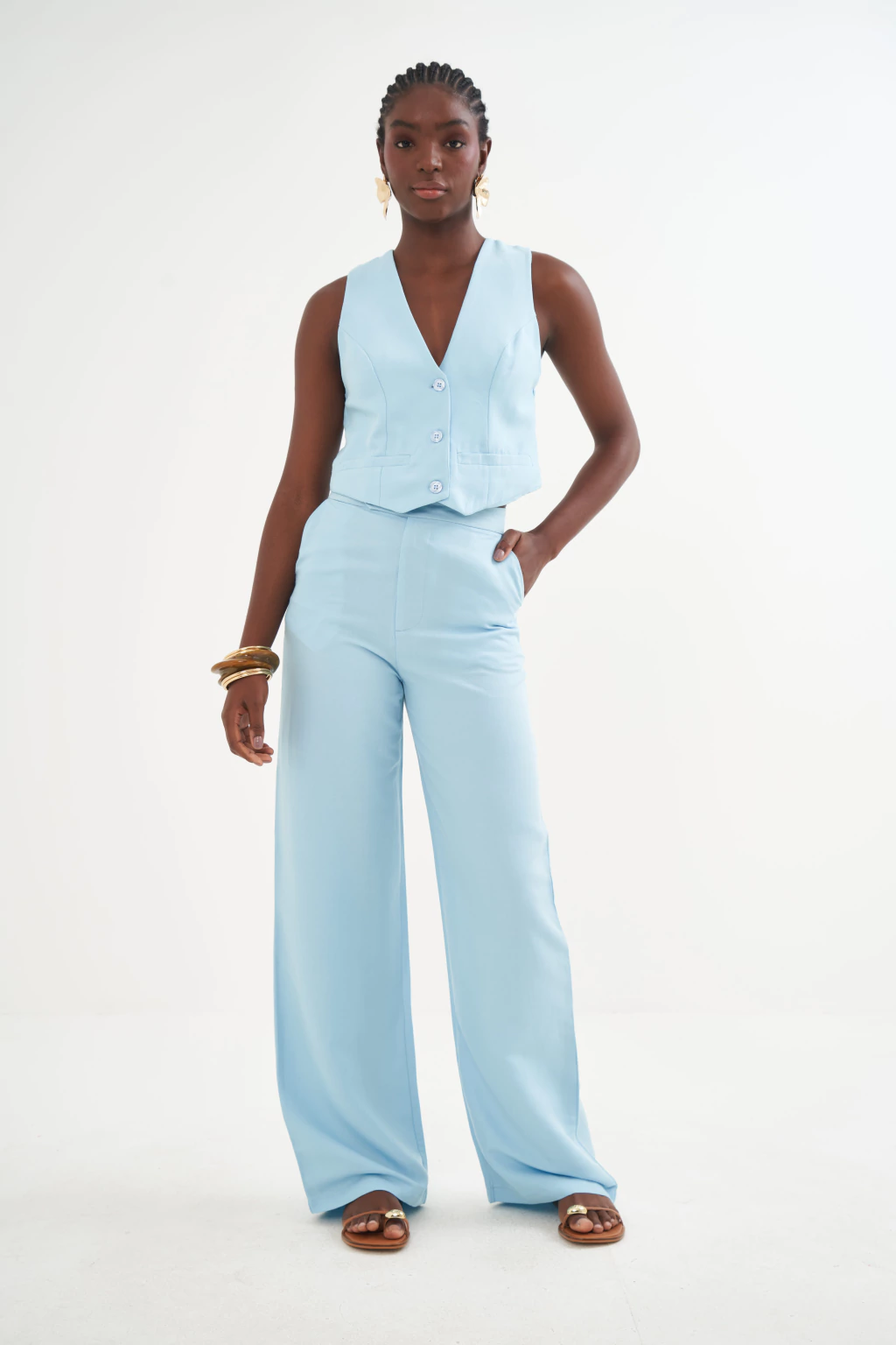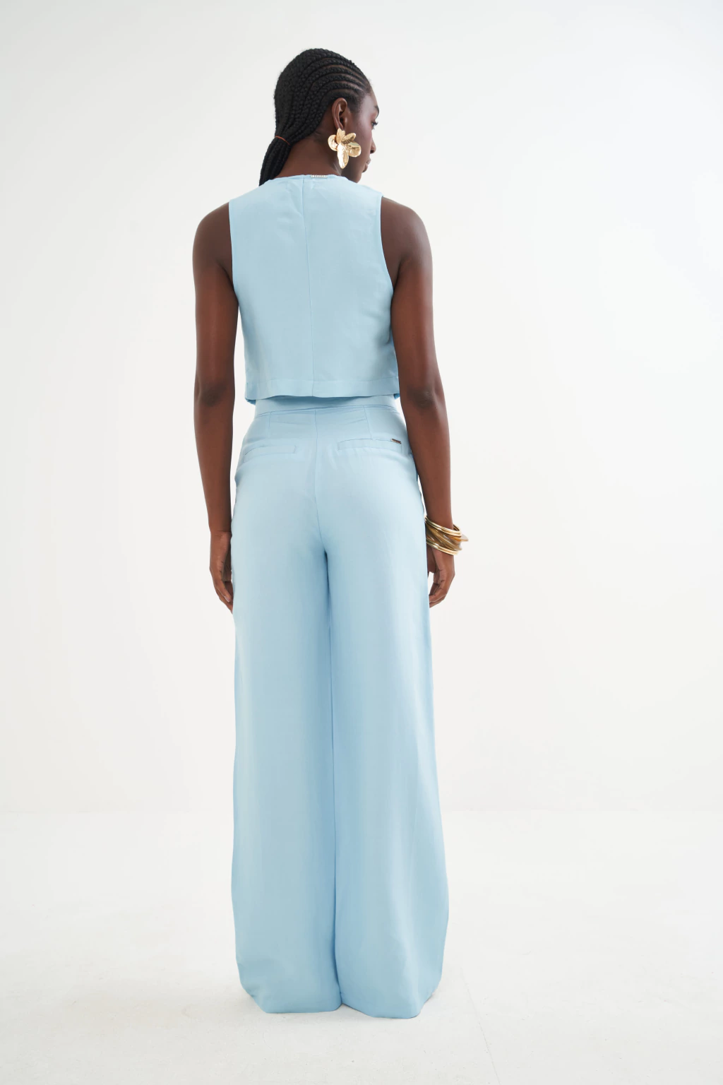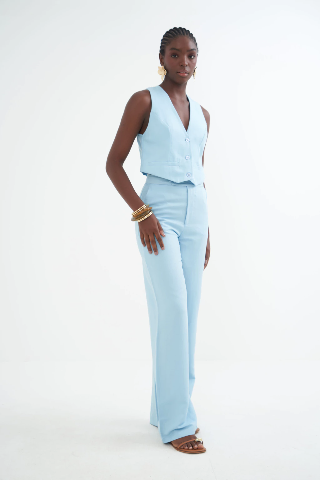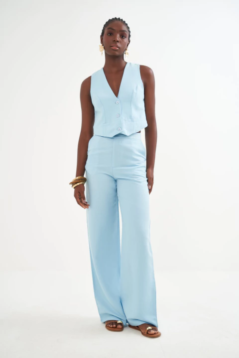 Este colete é a personificação da elegância refrescante que define a coleção RIVIERA. A cor, um azul pastel que evoca a serenidade do céu de primavera, encontra a sofisticação da alfaiataria clássica, criando uma peça versátil e cheia de charme. Feito com o toque nobre do linho, é a escolha ideal para a mulher que busca um visual autêntico, que une o poder e a leveza de forma inovadora.